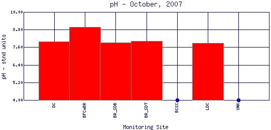 pH measures hydrogen concentration in water. pH is presented on a scale from 0 to 14. A solution with a pH value of 7 is neutral; a solution with a pH value less than 7 is acidic; a solution with a pH value greater than 7 is basic. Natural waters usually have a pH between 6 and 9. The scale is negatively logarithmic, so each whole number (reading downward) is ten times the preceding one (for example, pH 5.5 is 100 times as acidic as pH 7.5). The pH of natural waters can be made acidic or basic by human activities. For example, coal-burning power plants and heavy automobile traffic can produce nitrous oxides and sulfur dioxide, making the rain and snow highly acidic.