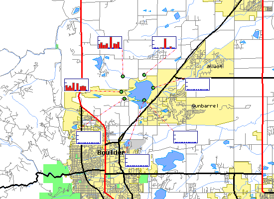 Flow is the volume of water moving past a point in a unit of time. Two things make up flow: the volume of water in the stream, and the velocity of the water moving past a given point. Flow affects the concentration of dissolved oxygen, natural substances, and pollutants in a water body. Flow is measured in units of cubic feet per second (cfs). Peak flows for Boulder Creek in the spring can reach as high as 300-800 cfs and as low as 10-50 cfs in the fall months. | |||||||