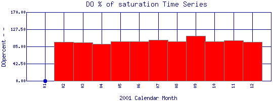 DO Percent of Saturation Time Series for 2001 Como Creek where it enters Lakewood Res. |
