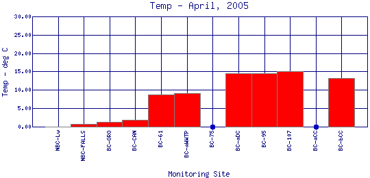 The above map indicates water quality monitoring sites. To view data at a specific site select it from the map with the mouse.