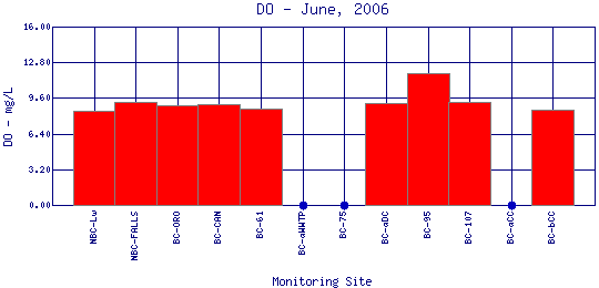 Dissolved Oxygen (DO) is the amount of oxygen dissolved in the water. DO is a very important indicator of a water body's ability to support aquatic life. The amount of DO in water depends on several factors, including temperature (the colder the water, the more oxygen can be dissolved); the volume and velocity of water flowing in the water body; and the amount of organisms using oxygen for respiration. The amount of oxygen dissolved in water is expressed as a concentration, in milligrams per liter (mg/l) of water. The optimal DO for adult brown trout is 9-12 mg/l. Human activities that affect DO levels include the removal of riparian vegetation, runoff from roads, and sewage discharge.