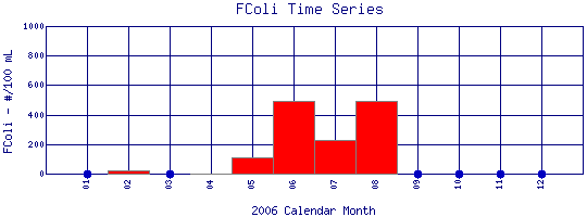 is found in the intestinal tracts of mammals. High concentrations of the bacteria in water or sludge suggest the presence of disease-causing organisms, and may be caused by septic tank failure, poor pasture and animal keeping practices, pet waste, and urban runoff. To measure fecal coliform bacteria, water samples are collected in sterilized containers, filtered, and incubated at a certain temperature. The resulting bacterial colonies that form are counted and recorded as the number of colony producing units per 100 ml of water (CPU/100 ml). Safe drinking water should have fecal coliform counts of 0 CPU/100 ml. For safe swimming, concentrations less than 200 CPU/100 ml is desirable, and for boating, less than 1000 CPU/100 ml is desirable. However, these standards may vary at the local, state, and federal level. |