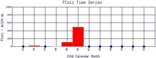 is found in the intestinal tracts of mammals. High concentrations of the bacteria in water or sludge suggest the presence of disease-causing organisms, and may be caused by septic tank failure, poor pasture and animal keeping practices, pet waste, and urban runoff. To measure fecal coliform bacteria, water samples are collected in sterilized containers, filtered, and incubated at a certain temperature. The resulting bacterial colonies that form are counted and recorded as the number of colony producing units per 100 ml of water (CPU/100 ml). Safe drinking water should have fecal coliform counts of 0 CPU/100 ml. For safe swimming, concentrations less than 200 CPU/100 ml is desirable, and for boating, less than 1000 CPU/100 ml is desirable. However, these standards may vary at the local, state, and federal level. |