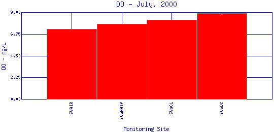 Dissolved Oxygen (DO) is the amount of oxygen dissolved in the water. DO is a very important indicator of a water body's ability to support aquatic life. The amount of DO in water depends on several factors, including temperature (the colder the water, the more oxygen can be dissolved); the volume and velocity of water flowing in the water body; and the amount of organisms using oxygen for respiration. The amount of oxygen dissolved in water is expressed as a concentration, in milligrams per liter (mg/l) of water. The optimal DO for adult brown trout is 9-12 mg/l. Human activities that affect DO levels include the removal of riparian vegetation, runoff from roads, and sewage discharge. | |||||||||||||||||||||