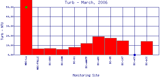 The above map indicates water quality monitoring sites. To view data at a specific site select it from the map with the mouse.