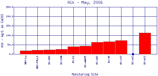 Alkalinity refers to how well a water body can neutralize acids. Alkalinity measures the amount of alkaline compounds in water, such as carbonates (CO3 2-), bicarbonates (HCO3 -), and hydroxides (OH-). These compounds are natural buffers that can remove excess hydrogen ions that have been added from sources such as acid rain or acid mine drainage. Alkalinity mitigates or relieves metals toxicity by using available HCO3 - and CO3 2- to take metals out of solution, thus making it unavailable to fish. Alkalinity is affected by the geology of the watershed; watersheds containing limestone will have a higher alkalinity than watersheds where granite is predominant. The Boulder Creek Watershed is composed primarily of granite rocks, thus the water has a lower alkalinity content.
