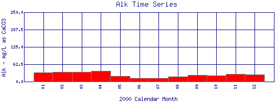 Select on the parameter name to view all Total Alkalinity time series plots on the basin map. Select on the table date to view stream Total Alkalinity profiles observed on that date. Select here to view all parameters at this site.
