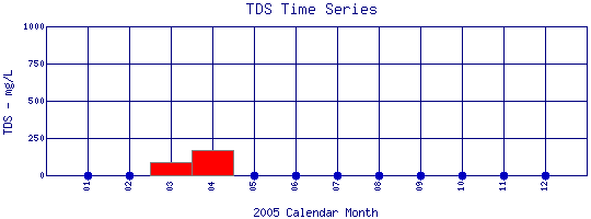 Select on the parameter name to view all Total Dissolved Solids time series plots on the basin map. Select on the table date to view stream Total Dissolved Solids profiles observed on that date. Select here to view all parameters at this site.