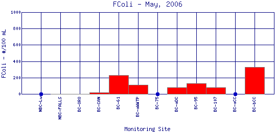 Fecal Coliform Bacteria is found in the intestinal tracts of mammals. High concentrations of the bacteria in water or sludge suggest the presence of disease-causing organisms, and may be caused by septic tank failure, poor pasture and animal keeping practices, pet waste, and urban runoff. To measure fecal coliform bacteria, water samples are collected in sterilized containers, filtered, and incubated at a certain temperature. The resulting bacterial colonies that form are counted and recorded as the number of colony producing units per 100 ml of water (CPU/100 ml). Safe drinking water should have fecal coliform counts of 0 CPU/100 ml. For safe swimming, concentrations less than 200 CPU/100 ml is desirable, and for boating, less than 1000 CPU/100 ml is desirable. However, these standards may vary at the local, state, and federal level. | |||||||||||||||||||||||||||||||||||||||||||||