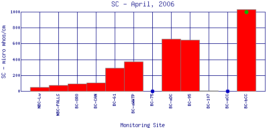 Specific Conductance is a measure of how well water can pass an electrical current. It is an indirect measure of the presence of inorganic dissolved solids, such as chloride, nitrate, sulfate, phosphate, sodium, magnesium, calcium, and iron. These substances conduct electricity because they are negatively or positively charged when dissolved in water. The concentration of dissolved solids, or the conductivity, is affected by the bedrock and soil in the watershed. It is also affected by human influences. For example, agricultural runoff can raise conductivity because of the presence of phosphate and nitrate.