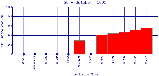 Specific Conductance is a measure of how well water can pass an electrical current. It is an indirect measure of the presence of inorganic dissolved solids, such as chloride, nitrate, sulfate, phosphate, sodium, magnesium, calcium, and iron. These substances conduct electricity because they are negatively or positively charged when dissolved in water. The concentration of dissolved solids, or the conductivity, is affected by the bedrock and soil in the watershed. It is also affected by human influences. For example, agricultural runoff can raise conductivity because of the presence of phosphate and nitrate.