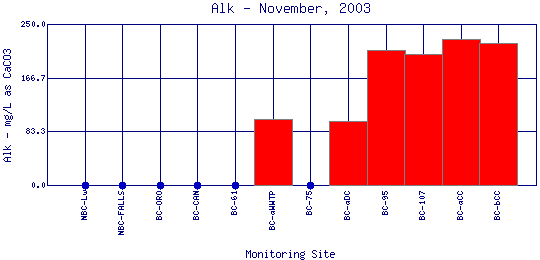 Alkalinity refers to how well a water body can neutralize acids. Alkalinity measures the amount of alkaline compounds in water, such as carbonates (CO3 2-), bicarbonates (HCO3 -), and hydroxides (OH-). These compounds are natural buffers that can remove excess hydrogen ions that have been added from sources such as acid rain or acid mine drainage. Alkalinity mitigates or relieves metals toxicity by using available HCO3 - and CO3 2- to take metals out of solution, thus making it unavailable to fish. Alkalinity is affected by the geology of the watershed; watersheds containing limestone will have a higher alkalinity than watersheds where granite is predominant. The Boulder Creek Watershed is composed primarily of granite rocks, thus the water has a lower alkalinity content.
