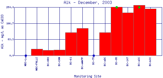Alkalinity refers to how well a water body can neutralize acids. Alkalinity measures the amount of alkaline compounds in water, such as carbonates (CO3 2-), bicarbonates (HCO3 -), and hydroxides (OH-). These compounds are natural buffers that can remove excess hydrogen ions that have been added from sources such as acid rain or acid mine drainage. Alkalinity mitigates or relieves metals toxicity by using available HCO3 - and CO3 2- to take metals out of solution, thus making it unavailable to fish. Alkalinity is affected by the geology of the watershed; watersheds containing limestone will have a higher alkalinity than watersheds where granite is predominant. The Boulder Creek Watershed is composed primarily of granite rocks, thus the water has a lower alkalinity content.