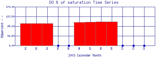 Select on the parameter name to view all DO Percent of Saturation time series plots on the basin map. Select on the table date to view stream DO Percent of Saturation profiles observed on that date. Select here to view all parameters at this site.