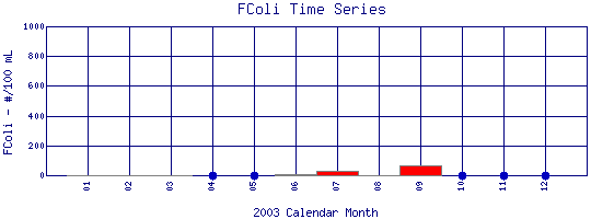 Select on the parameter name to view all Fecal Coliform time series plots on the basin map. Select on the table date to view stream Fecal Coliform profiles observed on that date. Select here to view all parameters at this site.
