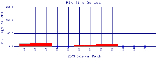Select on the parameter name to view all Total Alkalinity time series plots on the basin map. Select on the table date to view stream Total Alkalinity profiles observed on that date. Select here to view all parameters at this site.