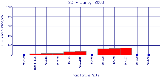 Specific Conductance is a measure of how well water can pass an electrical current. It is an indirect measure of the presence of inorganic dissolved solids, such as chloride, nitrate, sulfate, phosphate, sodium, magnesium, calcium, and iron. These substances conduct electricity because they are negatively or positively charged when dissolved in water. The concentration of dissolved solids, or the conductivity, is affected by the bedrock and soil in the watershed. It is also affected by human influences. For example, agricultural runoff can raise conductivity because of the presence of phosphate and nitrate.