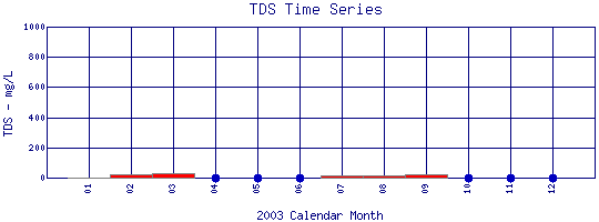 Select on the parameter name to view all Total Dissolved Solids time series plots on the basin map. Select on the table date to view stream Total Dissolved Solids profiles observed on that date. Select here to view all parameters at this site.
