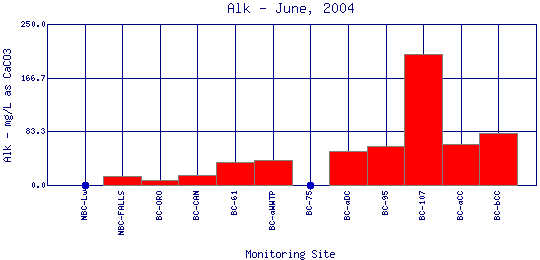 Alkalinity refers to how well a water body can neutralize acids. Alkalinity measures the amount of alkaline compounds in water, such as carbonates (CO3 2-), bicarbonates (HCO3 -), and hydroxides (OH-). These compounds are natural buffers that can remove excess hydrogen ions that have been added from sources such as acid rain or acid mine drainage. Alkalinity mitigates or relieves metals toxicity by using available HCO3 - and CO3 2- to take metals out of solution, thus making it unavailable to fish. Alkalinity is affected by the geology of the watershed; watersheds containing limestone will have a higher alkalinity than watersheds where granite is predominant. The Boulder Creek Watershed is composed primarily of granite rocks, thus the water has a lower alkalinity content.