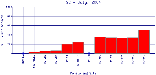 Specific Conductance is a measure of how well water can pass an electrical current. It is an indirect measure of the presence of inorganic dissolved solids, such as chloride, nitrate, sulfate, phosphate, sodium, magnesium, calcium, and iron. These substances conduct electricity because they are negatively or positively charged when dissolved in water. The concentration of dissolved solids, or the conductivity, is affected by the bedrock and soil in the watershed. It is also affected by human influences. For example, agricultural runoff can raise conductivity because of the presence of phosphate and nitrate.