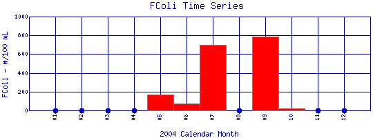 is found in the intestinal tracts of mammals. High concentrations of the bacteria in water or sludge suggest the presence of disease-causing organisms, and may be caused by septic tank failure, poor pasture and animal keeping practices, pet waste, and urban runoff. To measure fecal coliform bacteria, water samples are collected in sterilized containers, filtered, and incubated at a certain temperature. The resulting bacterial colonies that form are counted and recorded as the number of colony producing units per 100 ml of water (CPU/100 ml). Safe drinking water should have fecal coliform counts of 0 CPU/100 ml. For safe swimming, concentrations less than 200 CPU/100 ml is desirable, and for boating, less than 1000 CPU/100 ml is desirable. However, these standards may vary at the local, state, and federal level. |