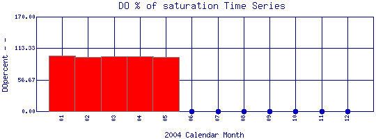 DO Percent of Saturation Time Series for 2004 Como Creek where it enters Lakewood Res. |