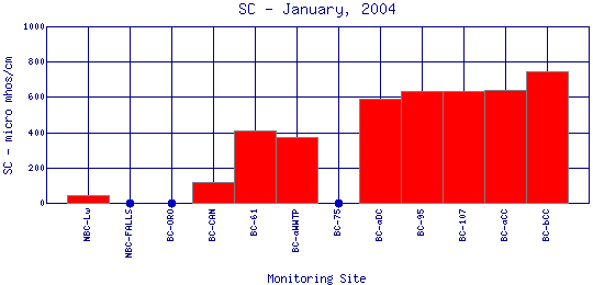 Specific Conductance is a measure of how well water can pass an electrical current. It is an indirect measure of the presence of inorganic dissolved solids, such as chloride, nitrate, sulfate, phosphate, sodium, magnesium, calcium, and iron. These substances conduct electricity because they are negatively or positively charged when dissolved in water. The concentration of dissolved solids, or the conductivity, is affected by the bedrock and soil in the watershed. It is also affected by human influences. For example, agricultural runoff can raise conductivity because of the presence of phosphate and nitrate.