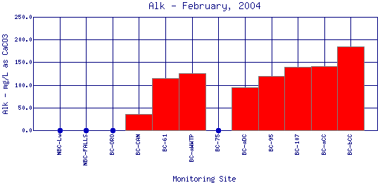 Alkalinity refers to how well a water body can neutralize acids. Alkalinity measures the amount of alkaline compounds in water, such as carbonates (CO3 2-), bicarbonates (HCO3 -), and hydroxides (OH-). These compounds are natural buffers that can remove excess hydrogen ions that have been added from sources such as acid rain or acid mine drainage. Alkalinity mitigates or relieves metals toxicity by using available HCO3 - and CO3 2- to take metals out of solution, thus making it unavailable to fish. Alkalinity is affected by the geology of the watershed; watersheds containing limestone will have a higher alkalinity than watersheds where granite is predominant. The Boulder Creek Watershed is composed primarily of granite rocks, thus the water has a lower alkalinity content.