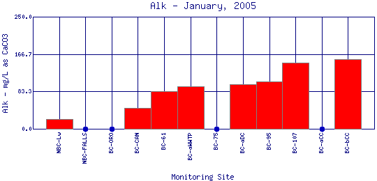 Alkalinity refers to how well a water body can neutralize acids. Alkalinity measures the amount of alkaline compounds in water, such as carbonates (CO3 2-), bicarbonates (HCO3 -), and hydroxides (OH-). These compounds are natural buffers that can remove excess hydrogen ions that have been added from sources such as acid rain or acid mine drainage. Alkalinity mitigates or relieves metals toxicity by using available HCO3 - and CO3 2- to take metals out of solution, thus making it unavailable to fish. Alkalinity is affected by the geology of the watershed; watersheds containing limestone will have a higher alkalinity than watersheds where granite is predominant. The Boulder Creek Watershed is composed primarily of granite rocks, thus the water has a lower alkalinity content.