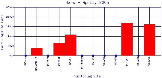 Hardness generally refers to the amount of calcium and magnesium in water. In household use, these cations (ions with a charge greater than +1) can prevent soap from sudsing and leave behind a white scum in bathtubs. In the aquatic environment, calcium and magnesium help keep fish from absorbing metals, such as lead, arsenic, and cadmium, into their bloodstream through their gills. Therefore, the harder the water, the less easy it is for toxic metals to absorb onto gills. Water in the Boulder Creek watershed is generally soft because the water comes mainly from melting snow which is low in minerals and metals.