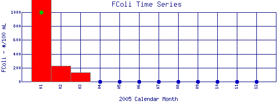 Select on the parameter name to view all Fecal Coliform time series plots on the basin map. Select on the table date to view stream Fecal Coliform profiles observed on that date. Select here to view all parameters at this site.