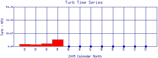 Select on the parameter name to view all Turbidity time series plots on the basin map. Select on the table date to view stream Turbidity profiles observed on that date. Select here to view all parameters at this site.