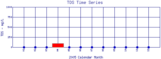 Select on the parameter name to view all Total Dissolved Solids time series plots on the basin map. Select on the table date to view stream Total Dissolved Solids profiles observed on that date. Select here to view all parameters at this site.