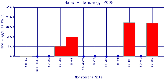 Hardness generally refers to the amount of calcium and magnesium in water. In household use, these cations (ions with a charge greater than +1) can prevent soap from sudsing and leave behind a white scum in bathtubs. In the aquatic environment, calcium and magnesium help keep fish from absorbing metals, such as lead, arsenic, and cadmium, into their bloodstream through their gills. Therefore, the harder the water, the less easy it is for toxic metals to absorb onto gills. Water in the Boulder Creek watershed is generally soft because the water comes mainly from melting snow which is low in minerals and metals.