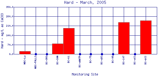 Hardness generally refers to the amount of calcium and magnesium in water. In household use, these cations (ions with a charge greater than +1) can prevent soap from sudsing and leave behind a white scum in bathtubs. In the aquatic environment, calcium and magnesium help keep fish from absorbing metals, such as lead, arsenic, and cadmium, into their bloodstream through their gills. Therefore, the harder the water, the less easy it is for toxic metals to absorb onto gills. Water in the Boulder Creek watershed is generally soft because the water comes mainly from melting snow which is low in minerals and metals.