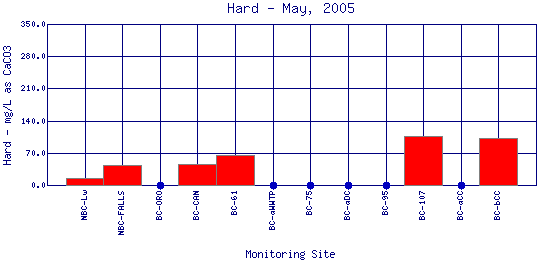 Hardness generally refers to the amount of calcium and magnesium in water. In household use, these cations (ions with a charge greater than +1) can prevent soap from sudsing and leave behind a white scum in bathtubs. In the aquatic environment, calcium and magnesium help keep fish from absorbing metals, such as lead, arsenic, and cadmium, into their bloodstream through their gills. Therefore, the harder the water, the less easy it is for toxic metals to absorb onto gills. Water in the Boulder Creek watershed is generally soft because the water comes mainly from melting snow which is low in minerals and metals.