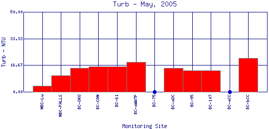 The above map indicates water quality monitoring sites. To view data at a specific site select it from the map with the mouse.