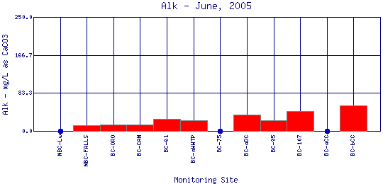 Alkalinity refers to how well a water body can neutralize acids. Alkalinity measures the amount of alkaline compounds in water, such as carbonates (CO3 2-), bicarbonates (HCO3 -), and hydroxides (OH-). These compounds are natural buffers that can remove excess hydrogen ions that have been added from sources such as acid rain or acid mine drainage. Alkalinity mitigates or relieves metals toxicity by using available HCO3 - and CO3 2- to take metals out of solution, thus making it unavailable to fish. Alkalinity is affected by the geology of the watershed; watersheds containing limestone will have a higher alkalinity than watersheds where granite is predominant. The Boulder Creek Watershed is composed primarily of granite rocks, thus the water has a lower alkalinity content.