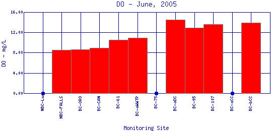 Dissolved Oxygen (DO) is the amount of oxygen dissolved in the water. DO is a very important indicator of a water body's ability to support aquatic life. The amount of DO in water depends on several factors, including temperature (the colder the water, the more oxygen can be dissolved); the volume and velocity of water flowing in the water body; and the amount of organisms using oxygen for respiration. The amount of oxygen dissolved in water is expressed as a concentration, in milligrams per liter (mg/l) of water. The optimal DO for adult brown trout is 9-12 mg/l. Human activities that affect DO levels include the removal of riparian vegetation, runoff from roads, and sewage discharge.