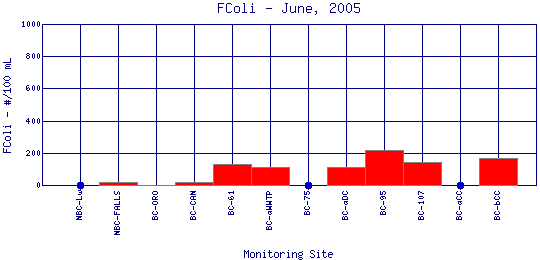 Longitudinal Fecal Coliform Profiles for June, 2005