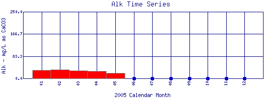Total Alkalinity Time Series for 2005 Como Creek where it enters Lakewood Res. |