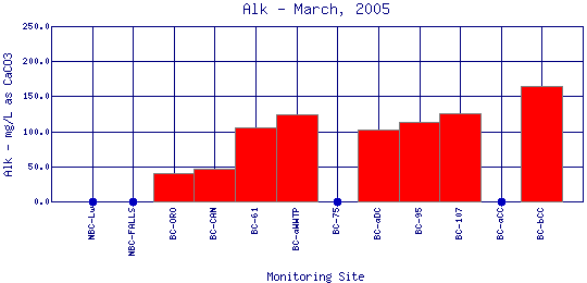 Alkalinity refers to how well a water body can neutralize acids. Alkalinity measures the amount of alkaline compounds in water, such as carbonates (CO3 2-), bicarbonates (HCO3 -), and hydroxides (OH-). These compounds are natural buffers that can remove excess hydrogen ions that have been added from sources such as acid rain or acid mine drainage. Alkalinity mitigates or relieves metals toxicity by using available HCO3 - and CO3 2- to take metals out of solution, thus making it unavailable to fish. Alkalinity is affected by the geology of the watershed; watersheds containing limestone will have a higher alkalinity than watersheds where granite is predominant. The Boulder Creek Watershed is composed primarily of granite rocks, thus the water has a lower alkalinity content.