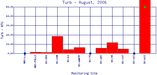 The above map indicates water quality monitoring sites. To view data at a specific site select it from the map with the mouse.