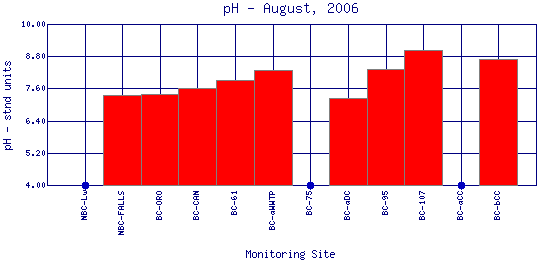 pH measures hydrogen concentration in water. pH is presented on a scale from 0 to 14. A solution with a pH value of 7 is neutral; a solution with a pH value less than 7 is acidic; a solution with a pH value greater than 7 is basic. Natural waters usually have a pH between 6 and 9. The scale is negatively logarithmic, so each whole number (reading downward) is ten times the preceding one (for example, pH 5.5 is 100 times as acidic as pH 7.5). The pH of natural waters can be made acidic or basic by human activities. For example, coal-burning power plants and heavy automobile traffic can produce nitrous oxides and sulfur dioxide, making the rain and snow highly acidic.