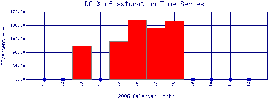 Select on the parameter name to view all DO Percent of Saturation time series plots on the basin map. Select on the table date to view stream DO Percent of Saturation profiles observed on that date. Select here to view all parameters at this site.