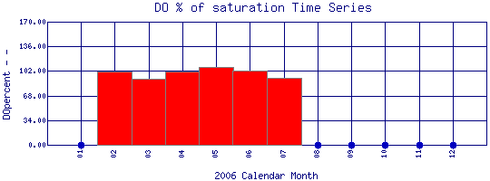 Select on the parameter name to view all DO Percent of Saturation time series plots on the basin map. Select on the table date to view stream DO Percent of Saturation profiles observed on that date. Select here to view all parameters at this site.