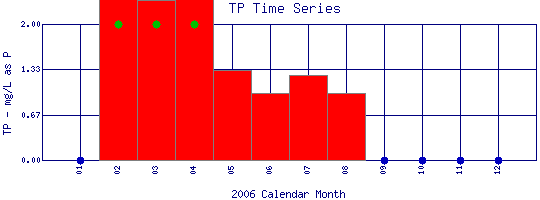 Select on the parameter name to view all Total Phosphate time series plots on the basin map. Select on the table date to view stream Total Phosphate profiles observed on that date. Select here to view all parameters at this site.