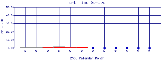 Select on the parameter name to view all Turbidity time series plots on the basin map. Select on the table date to view stream Turbidity profiles observed on that date. Select here to view all parameters at this site.