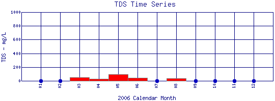 Select on the parameter name to view all Total Dissolved Solids time series plots on the basin map. Select on the table date to view stream Total Dissolved Solids profiles observed on that date. Select here to view all parameters at this site.