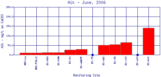 Alkalinity refers to how well a water body can neutralize acids. Alkalinity measures the amount of alkaline compounds in water, such as carbonates (CO3 2-), bicarbonates (HCO3 -), and hydroxides (OH-). These compounds are natural buffers that can remove excess hydrogen ions that have been added from sources such as acid rain or acid mine drainage. Alkalinity mitigates or relieves metals toxicity by using available HCO3 - and CO3 2- to take metals out of solution, thus making it unavailable to fish. Alkalinity is affected by the geology of the watershed; watersheds containing limestone will have a higher alkalinity than watersheds where granite is predominant. The Boulder Creek Watershed is composed primarily of granite rocks, thus the water has a lower alkalinity content.